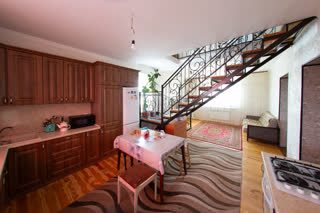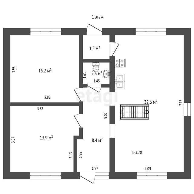· 1-й этаж: две просторные комнаты, санузел с душевой кабиной, большая кухня-гостиная — сердце дома, где удобно собираться всей семьёй.